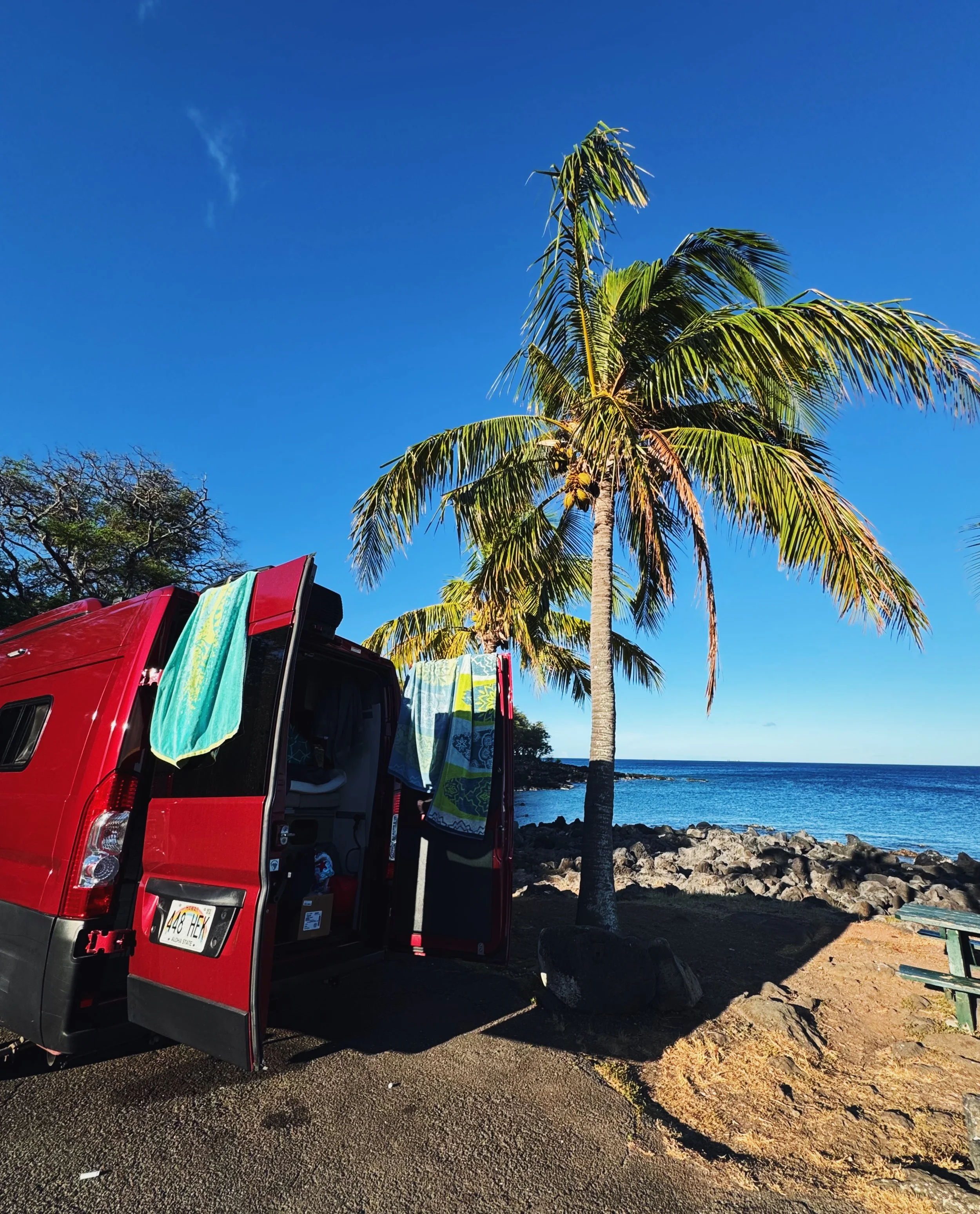 As I mentioned in my previous post, we went to the Big Island in Hawai’i last summer and spent four days exploring the island in a van. Since we had a toddler with us, we opted to rent a van that had a toilet and a shower, but unfortunately, when we picked it up, we were told the toilet wasn’t working, so we had to get creative.
